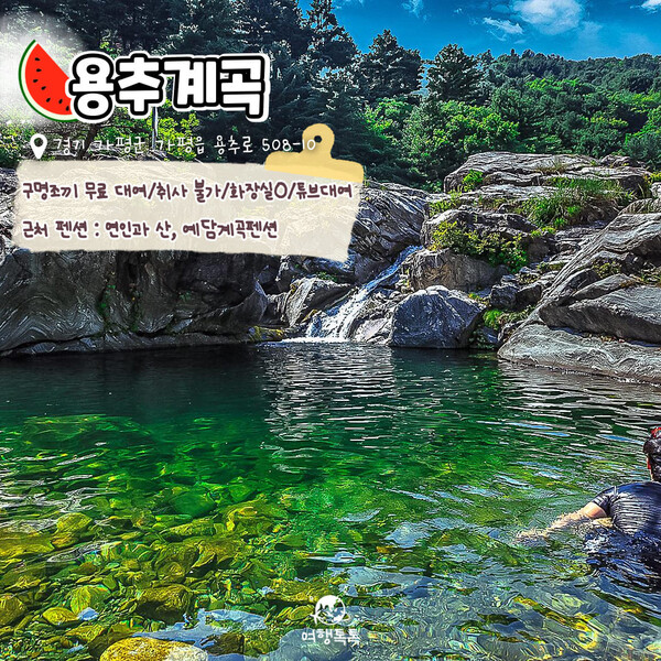 용추계곡은 가평에 위치해 있어요. 이곳은 수심이 깊지 않아 가족 단위 방문객들에게 인기가 많아요. 맑은 물에서 수영을 즐기거나, 주변의 아름다운 경치를 감상하며 피크닉을 즐기기에도 좋은 장소랍니다.